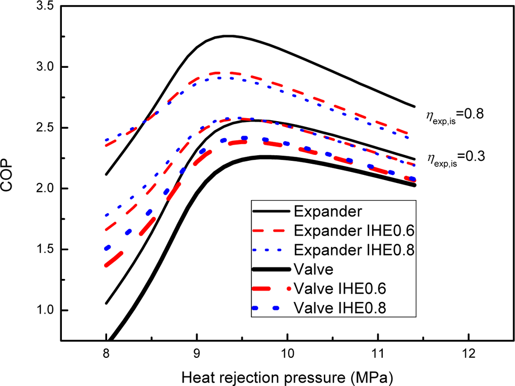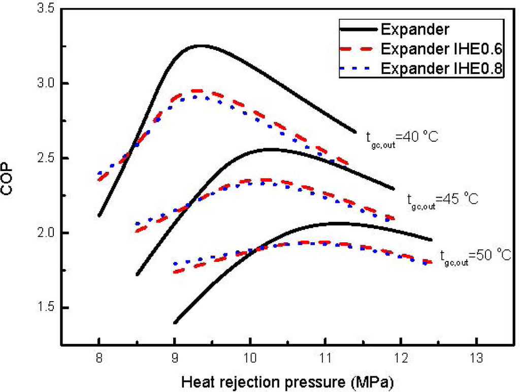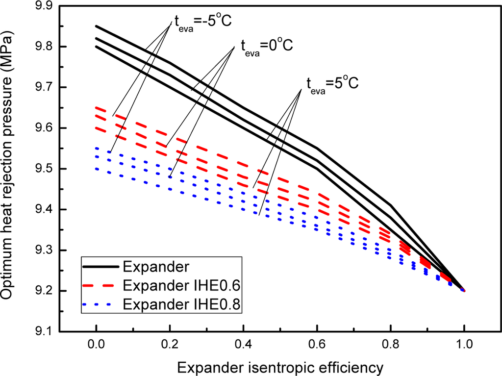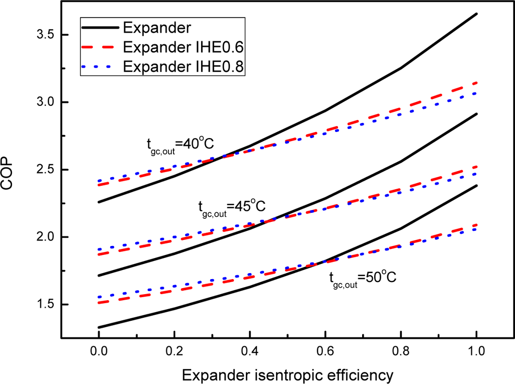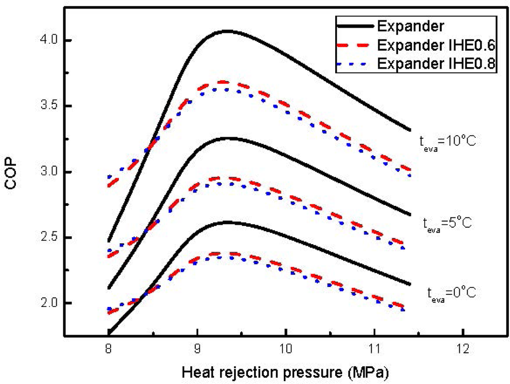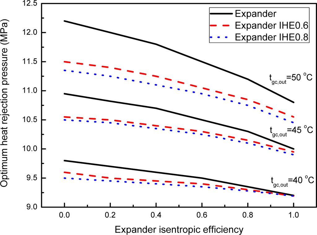 However, it can be seen from Figures 6 and 7 that the decrease degree of the optimum heat rejection pressure owing to the addition of an IHE becomes smaller along with the increase of the expander isentropic efficiency. For example, at an expander isentropic efficiency of 0, the optimum heat rejection pressure decreases by 3.06%, 4.11% and 6.97% respectively for a gas cooler outlet temperature of 40 45 and 50 °C owing to the addition of an IHE with an efficiency of 0.8. The three percentages become 0.11%, 1% and 3.24%, respectively, at an expander isentropic efficiency of 1.0. This implies that the positive effect of the decrease of the optimum heat rejection pressure owing to an IHE addition becomes weaker along with the increase of the expander isentropic efficiency.