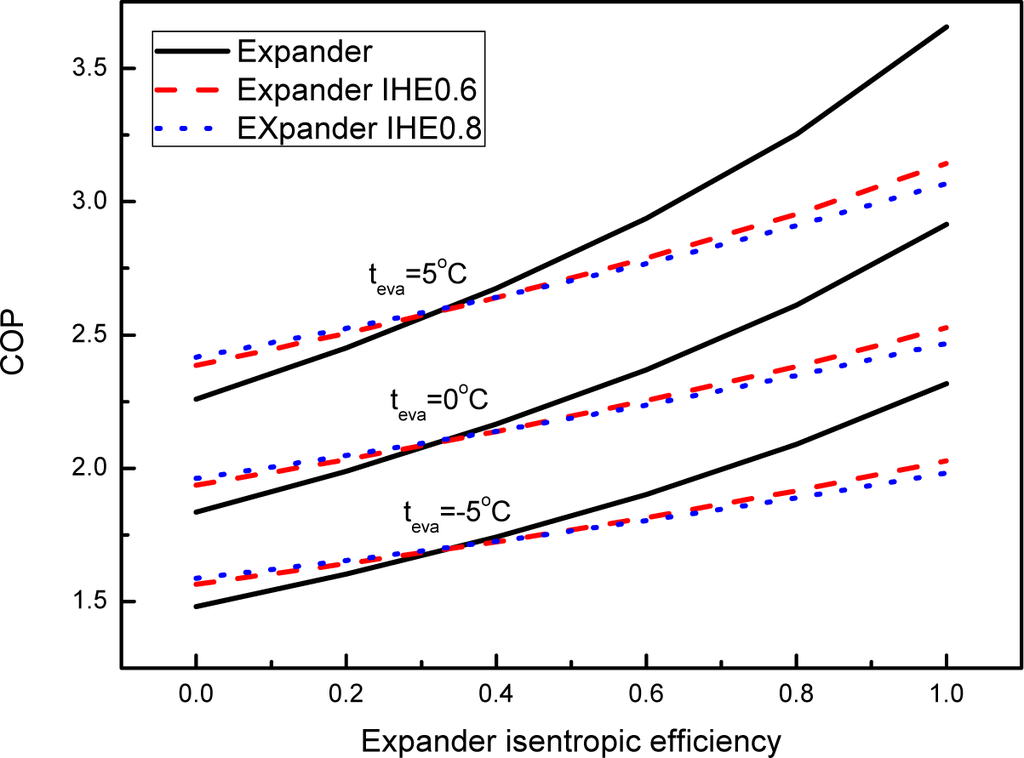 COP versus expander isentropic efficiency at different evaporating temperatures.