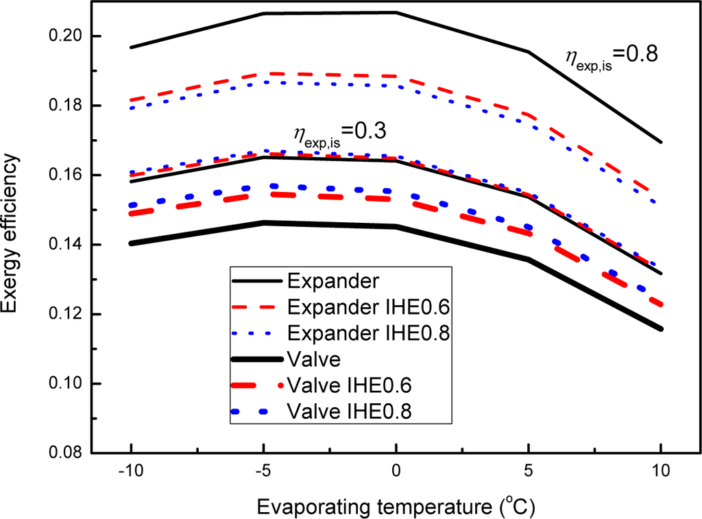 Figure 5 shows the variations of the maximum exergy efficiency versus the evaporating temperature for different expander isentropic efficiencies at the gas cooler outlet temperature of 40 °C. It reveals that the exergy efficiency can be improved by the IHE addition for the throttle valve cycle and the expander cycle with ηexp,is = 0.3, but the IHE addition in the expander cycle with ηexp,is = 0.8 degrades the exergy efficiency under the investigated evaporating temperatures.