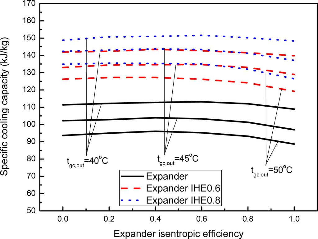 Figure 9 shows the variations of the specific cooling capacity with the expander isentropic efficiency for different gas cooler outlet temperatures at an evaporating temperature of 5 °C. Figure 10 shows the variations of the specific cooling capacity with the expander isentropic efficiency for different evaporating temperatures at a gas cooler outlet temperature of 40 °C. It can be seen that there is marginal variation in specific cooling capacity with expander isentropic efficiency, whereas a significant rise is observed owing to the IHE addition. The specific cooling capacity increases by 25.5%–34.8% at IHE efficiency of 0.6 and 29.2%–44.1% at IHE efficiency of 0.8 compared with that of the basic cycle. It implies that more capacity could be gained from the same scale of the cycle with IHE.