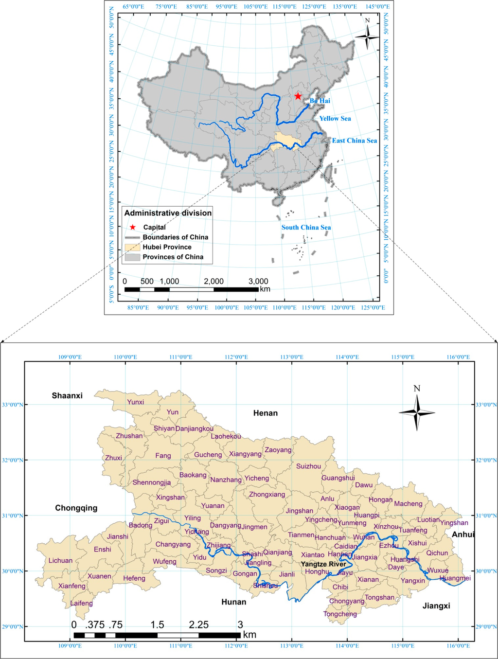 Among these tributaries, the Han River, which flows a distance of 858 km, is the largest tributary along the midstream of the Yangtze River. From northwest to southeast, the Han River flows across 13 counties and cities and flows into the Yangtze River at Wuhan City, the capital of Hubei Province. Furthermore, Hubei Province is called “The Province of Thousand Lakes” due to its abundant water resources. The lakes within the province have a total area of 2983.5 km2. Lakes Honghu, Changhu, Liangzi and Futou each cover more than 100 km2.