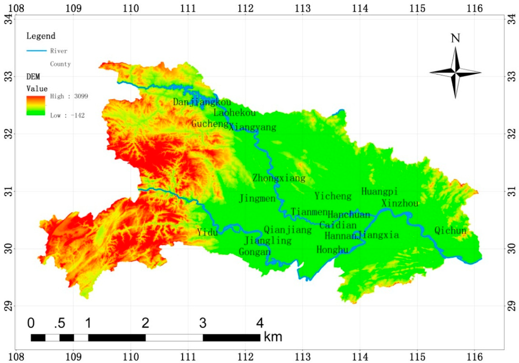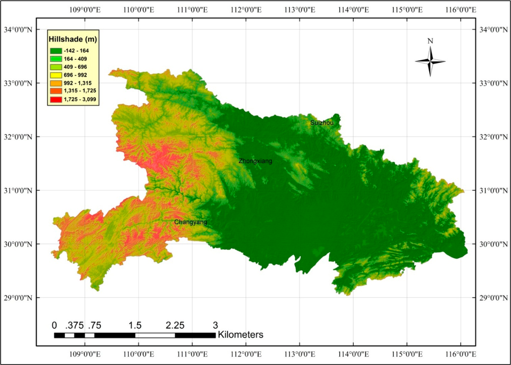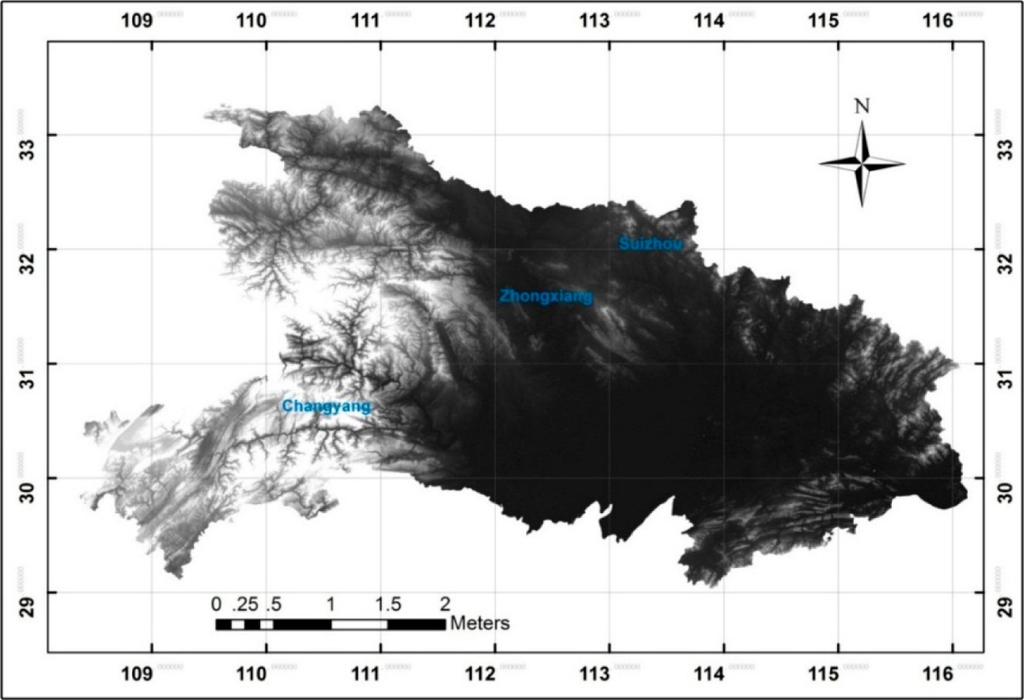 An image of the DEM mosaic with a spatial resolution of 30 m was generated after processing the mosaic with Envi software. The image contained the entire dimensions of Hubei Province, although the limits extended beyond the precise boundary of Hubei Province. We then added the image data and the vector data of the administrative district of Hubei Province using ArcMap 10 software. By applying the vectors as a clip feature using a geoprocessing function, we obtained the DEM of Hubei Province with a spatial resolution of 30 m (Figure 2).