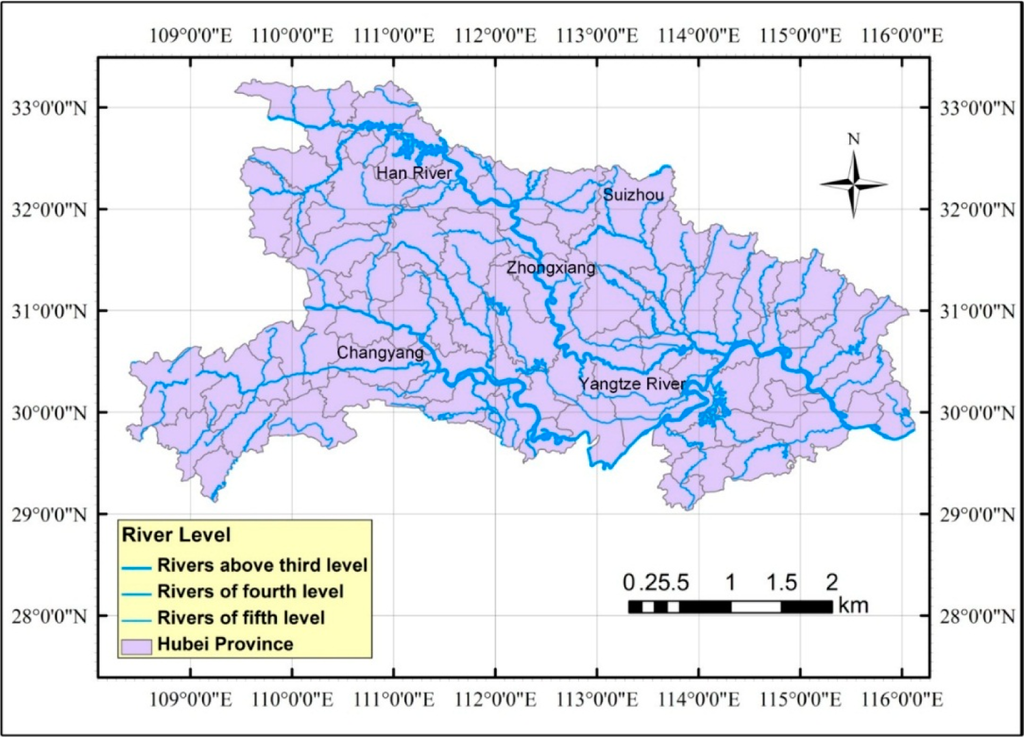 The spatial arrangement of rivers greater than 4th order in Hubei Province.
