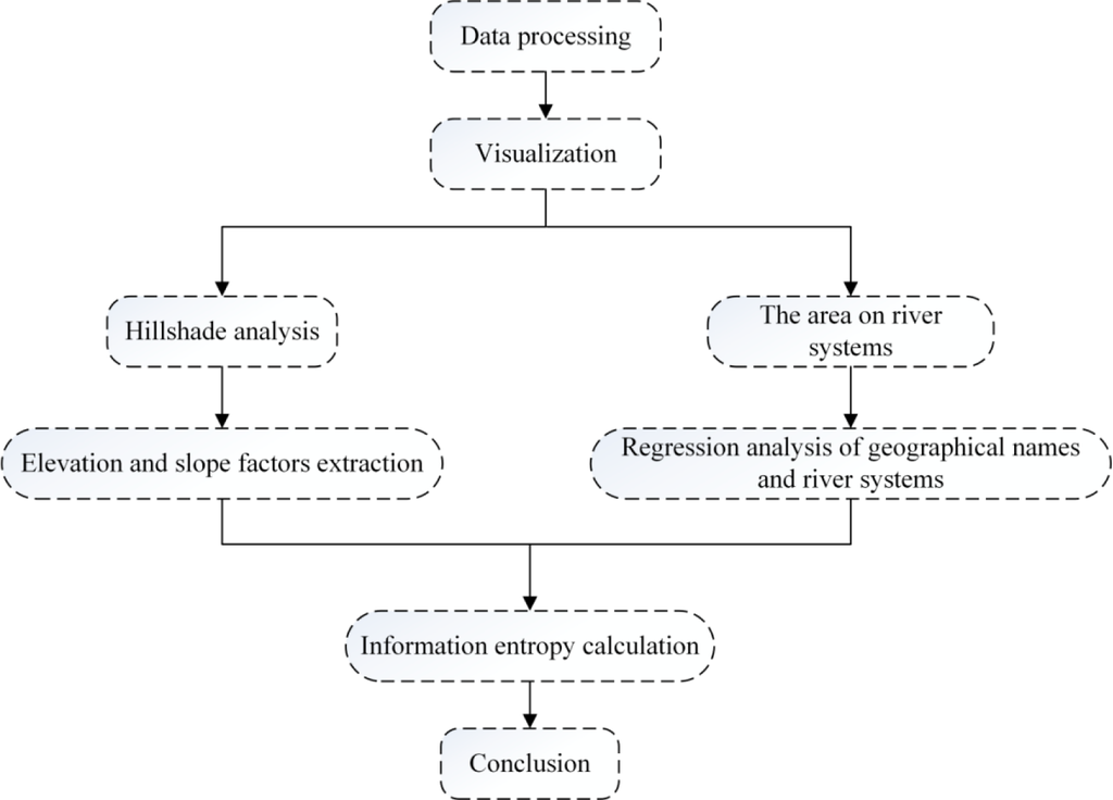 The flowchart for landscape analysis of geographical names is shown in Figure 4. It presents the data processing, visualization, hillshade analysis, regression analysis, information analysis and the conclusion. Data preparation and processing was introduced above, and the section analysis the relationship of geographical names and its natural landscape by visualization, hillshade analysis, regression analysis and information entropy.