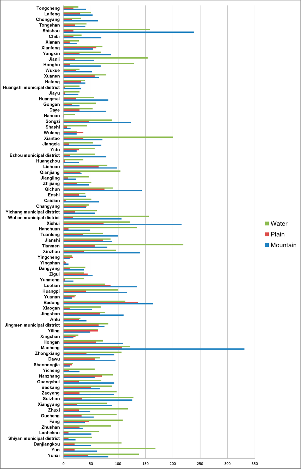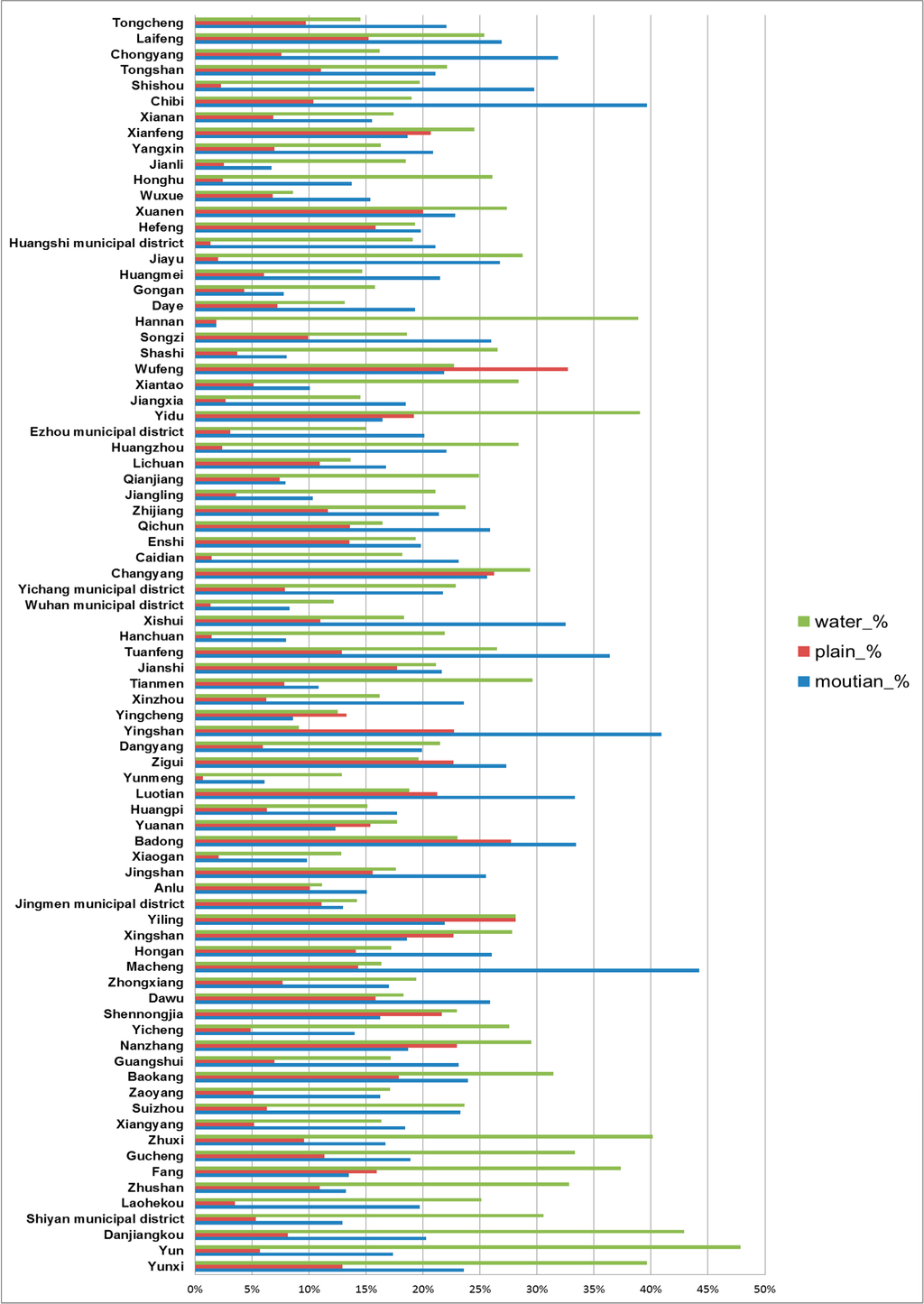 Because the statistics were recorded and digitised, the figures below show the absolute counts of landscape-related toponyms (mountain, plain and water) in the 80 county-level administrative districts (Figure 5). In general, the trends of these three types were coincident, meaning that the counts of the three types of landscape-related toponyms showed a parallel trend. However, because the total number of toponyms of each county varied, the absolute numbers were not appropriate. Consequently, another figure was created in which the relative values were expressed as percentages. The relative abundances of landscape-related toponyms (mountain, plain and water) of the 80 county-level administrative districts are shown in Figure 6. This figure is much better suited for explaining differences in the quantity of the landscape-related toponyms in the 80 counties.