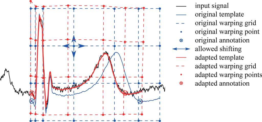 Illustration of the two-dimensional warping algorithm. The template beat (blue) is mapped to a warping grid (blue), which is adapted to the incoming beat (black) by moving the warping points such that the distance between template and incoming beat is minimized. The optimally fitted template and the corresponding warping points are shown in red.