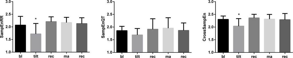 Sample entropy and cross-sample entropy of beat-to-beat RR and QT interval time series during baseline (bl), head-up tilt (tilt), recovery (rec), mental arithmetic task (ma) and recovery (rec) phases. Data are expressed as group mean values and standard deviations. Asterisks indicate significant changes with respect to baseline measurement. (*p < 0.05)
