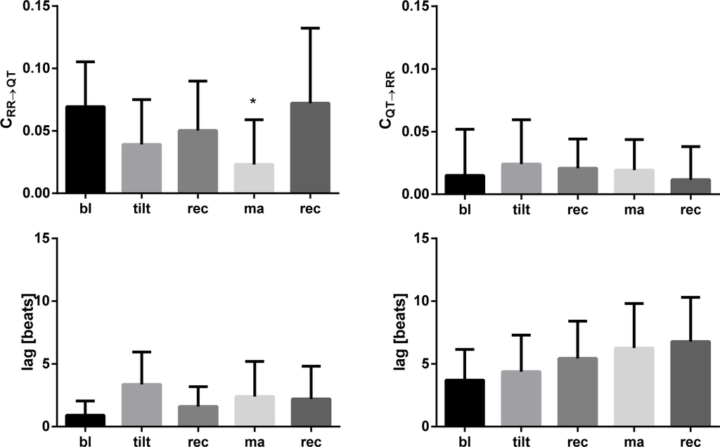 Conditional coupling from RR to QT and from QT to RR, respectively, with lags shown below during baseline (bl), head-up tilt (tilt), recovery (rec), mental arithmetic task (ma) and recovery (rec) phases. Data are expressed as group mean values and standard deviations. Asterisks indicate significant changes with respect to baseline measurement. (*p < 0.05)