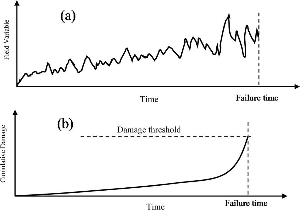 Thermodynamically, however, all damage mechanisms share a common feature at a much deeper level, which is dissipation of energy. Degradation processes are irreversible, meaning that they cause permanent (irreversible) alteration to the system and the surroundings. Dissipation is a fundamental measure of irreversibility and is common in natural phenomena, including chemical reactions, plastic deformations, frictions, and releases of heat. Dissipation can be quantified by entropy generation. Therefore, dissipation (or equivalently entropy generation) can be regarded as an alternative representation of cumulative damage. Based on this hypothesis, it follows that: