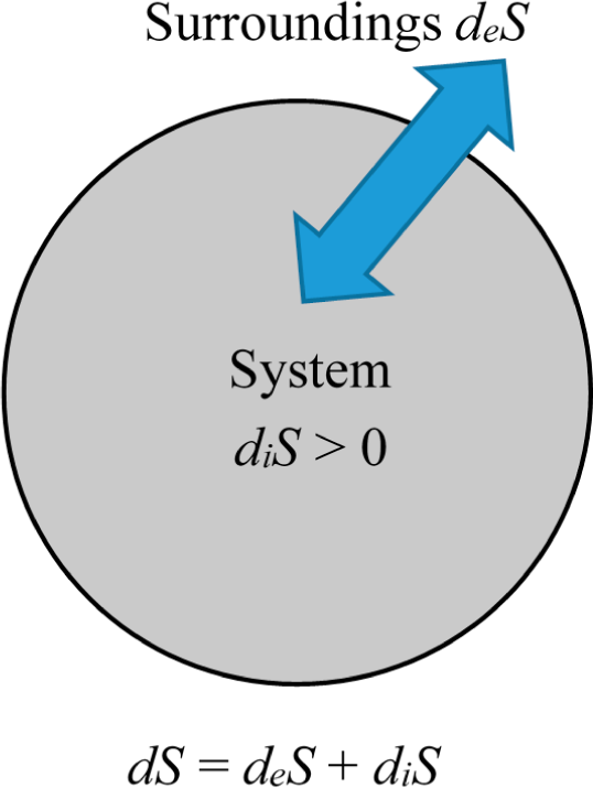 where deS is the entropy exchange (flow) with the surroundings and diS is the entropy generation inside the system (see Figure 2). The diS/dt represents internal irreversibility (dissipation) in the system. In addition to heat exchange, the system may exchange mass with the surroundings (i.e., in an open system such as in wear and corrosion). The entropy exchange (also known as entropy flow) can be positive, negative or zero. In case deS = 0, the system does not exchange heat and mass with the surroundings and the entropy flow is zero. Therefore, in Equation (2)dNk for an open system consists of mass change due to chemical reaction diNk and mass transport term deNk; i.e., dNk = diNk + deNk.