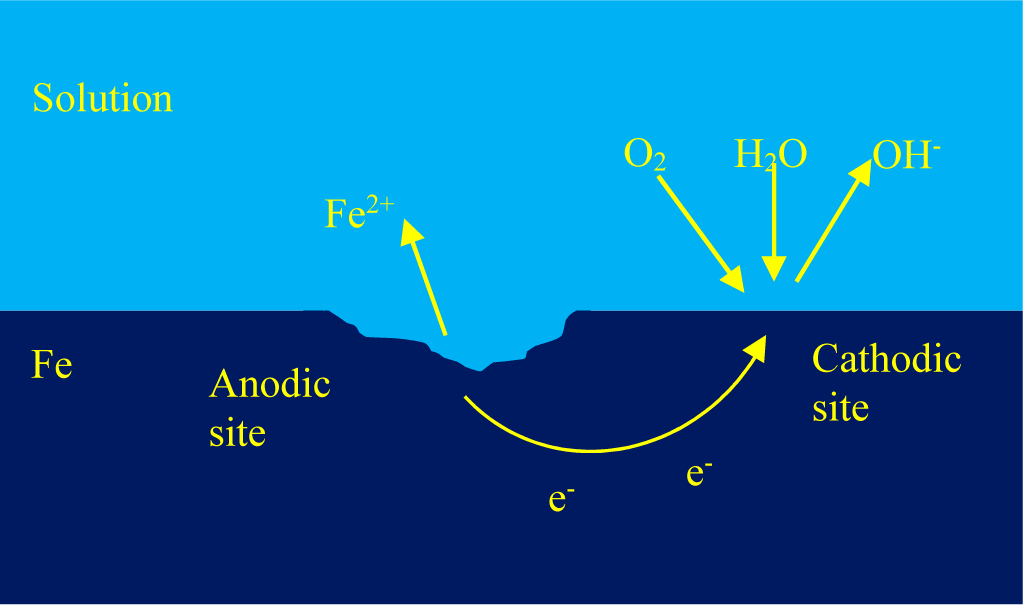 Anodic and cathodic reactions occur simultaneously at different locations on the surface. Figure 4 schematically shows the corrosion process that occurs at the surface of iron in basic solution.