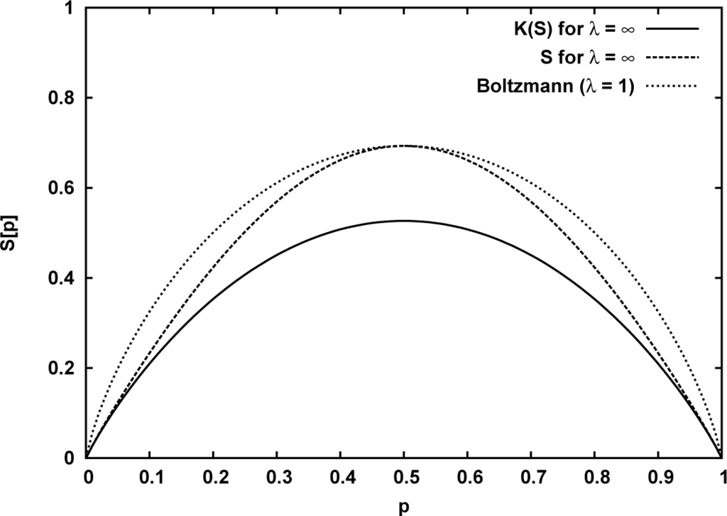 The extreme large fluctuation case, modeled by λ = ∞ and presented in Equation (40), leads to an allover concave entropy for the two state system: K∞(S[p, 1 − p]) is shown on the Figure 1 by the full line, while the back–deformed “Rényi-type” entropy formula is plotted by the dashed line. These curves are close to each other for the very low (and very high) probability, and maximally differ at the equiprobability point p = 0.5. However, in the latter point S[p, 1−p] has the same value as the traditional Boltzmann–Gibbs curve, for which S and K(S) coincide due to λ = 1.