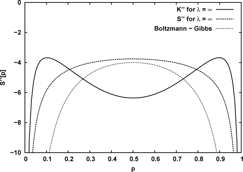 For investigating the concavity of the Equation (40) the second derivatives of the respective expressions, K∞(S∞), S∞ and the Boltzmann–Gibbs formula K1(S1) = S1 for the two-state system have to be inspected. This quantity is plotted on Figure 2 demonstrating that its value is negative in the whole range.