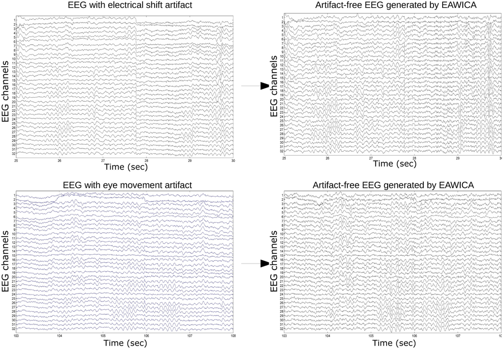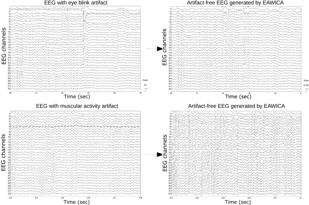 Figures 10 and 11 show examples of successful artifact removal for every kind of artifact. In the Supplementary Material, the whole original EEG and the corresponding EEG cleaned by EAWICA are provided.