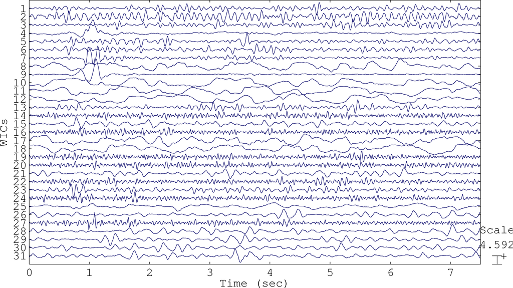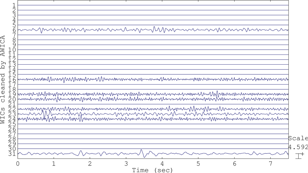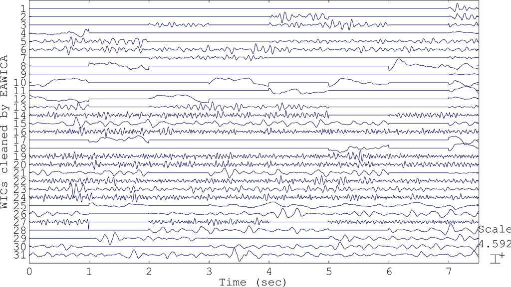 In AWICA, and generally in all of the techniques that are based on ICA, the independent components accounting for any artifact are normally entirely suppressed and the EEG is reconstructed totally discarding them. Usually, observing an artifactual independent component, cerebral activity is also visible, due to the impossibility of perfectly separating the artifactual signal from the brain waves. The main innovation of EAWICA is that only the artifactual segments in the artifactual components are canceled; therefore, the information about brain waves is better preserved in the segments not affected by artifactual activity. Once the artifactual WICs are selected as described in Section 2.1.4, they are gathered together in a matrix, and the samples (columns) belonging to the epochs where kurtosis or entropy exceeded threshold Th2 were set to zero. In other words, the epochs showing the artifactual event are detected and removed from the WICs, in order to preserve the brain waves as much as possible and minimally distort the EEG. This means that, once the artifactual WICs have been selected, for each WIC, the epochs where kurtosis or entropy exceeded the fixed threshold Th2 are canceled (the values are set to zero in that specific epoch). In order to emphasize the difference between AWICA and EAWICA, we plotted the group of independent components WICs (Figure 2) extracted during the processing of the dataset affected by eye blink artifacts and the corresponding WICs cleaned by AWICA (Figure 3) and by EAWICA (Figure 4). It is clear that the behavior of EAWICA is less invasive, because only the critical epochs of the WICs previously marked as artifactual are suppressed, whereas AWICA suppresses them completely.