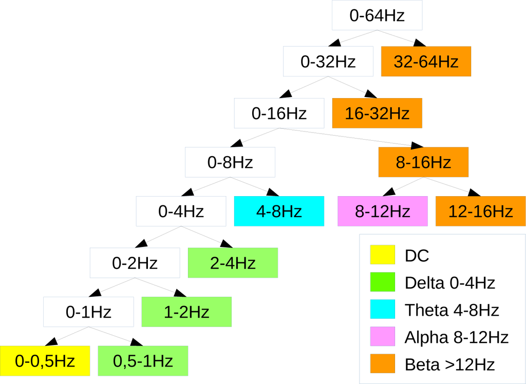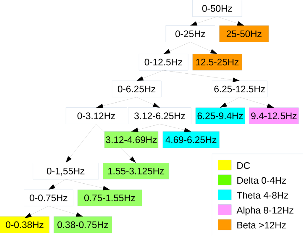 With regard to the semi-simulated EEG, since the frequency range was 0–50 Hz, aN = 6 level wavelet decomposition was implemented to partition the frequency range of interest into the sub-bands corresponding to the major EEG rhythms (delta: 0–4 Hz, theta: 4–8 Hz, alpha: 8–12 Hz, beta: above 12 Hz) and to discard the DC effects (Figure 5 shows the corresponding wavelet decomposition tree). Considering the real EEG, since the frequency range was 0–64 Hz, a N = 7 level wavelet decomposition partitioned the EEG into the four sub-bands discarding the DC component (Figure 6). The chosen wavelet family is the Daubechies order four wavelet (db4), being particularly suitable when dealing with EEG signals [34].
