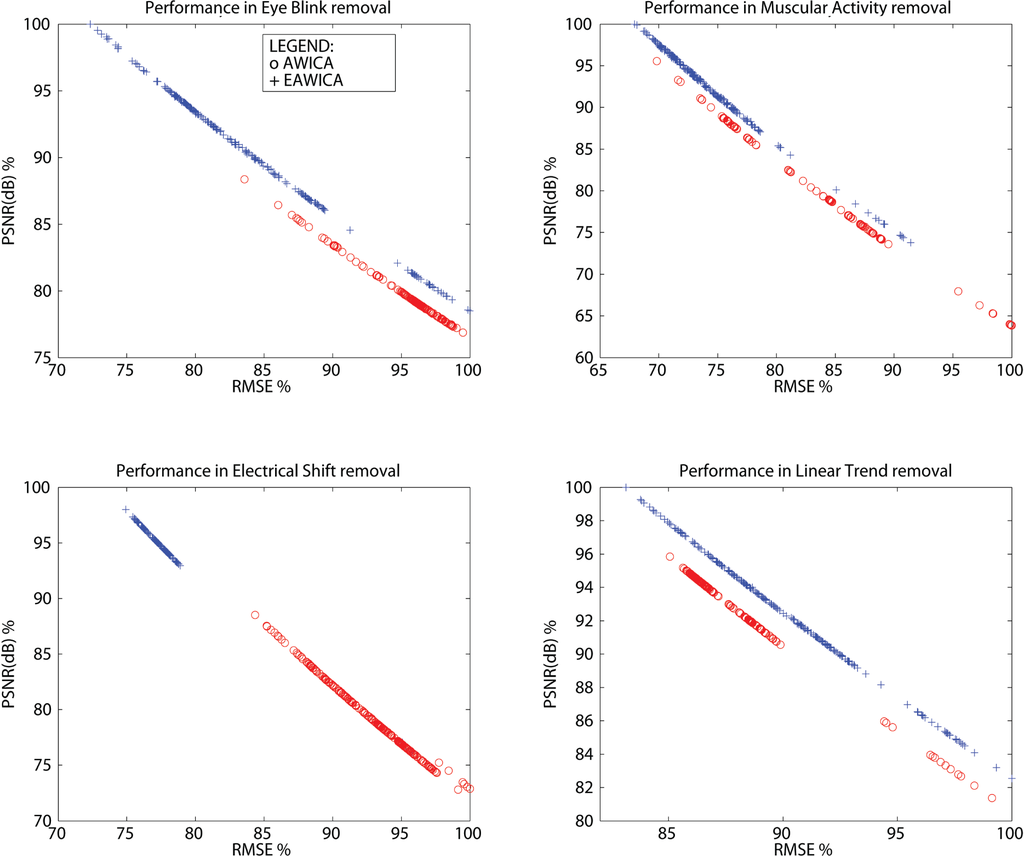 AWICA vs. EAWICA performance comparison for different Th1-Th2-α settings and different kinds of artifacts: eye blink (top-left); muscular activity (subplot top-right); electrical shift (bottom-left); linear trend (bottom-right). The original artifact-free EEG and the final reconstructed EEG are compared. The parameters used to compare the two signals are the peak-SNR and the RMSE (the settings corresponding to the largest PSNR and the smallest RMSE ensures the best performance and is defined as optimal). The x-axis accounts for percentual RMSE (referring to the overall largest RMSE, when the results of either AWICA and EAWICA are considered), and the y-axis accounts for percentual PSNR (referring to the overall largest PSNR, when the results of either AWICA and EAWICA are considered). The results yielded by AWICA are represented by a red (o), whereas the results yielded by EAWICA are represented by a blue (+).