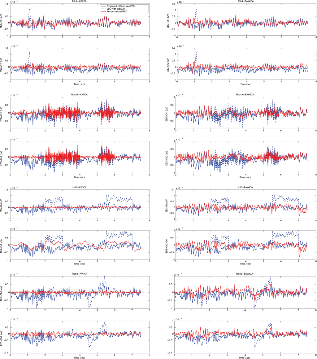Considering AWICA, the best performance was achieved in eye blink and muscular activity suppression. Electrical shift and the linear trend were reduced, but the EEG was partially distorted also in the artifact-free segments. Considering EAWICA, it provided better results in the removal of every artifact, together with lesser attenuation and distortion of the EEG signal in the artifact-free segments.
