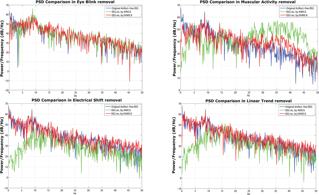 In order to investigate the severity of the distortion, the power spectrum of the artifact-free and reconstructed data are compared. Given the four semi-simulated artifactual EEG dataset on which AWICA and EAWICA were tested, in order to assess the effects of signal distortion, a comparison between the power spectral density (PSD) of a given artifact-free EEG signal and the PSD of the corresponding EEG signal corrupted and then reconstructed by AWICA and EAWICA is shown (Figure 9). We can infer that the PSD of the signals reconstructed by EAWICA overlap the PSD of the corresponding original artifact-free signals. Only considering eye blink removal, at about a frequency of 4 Hz, a distortion occurred.