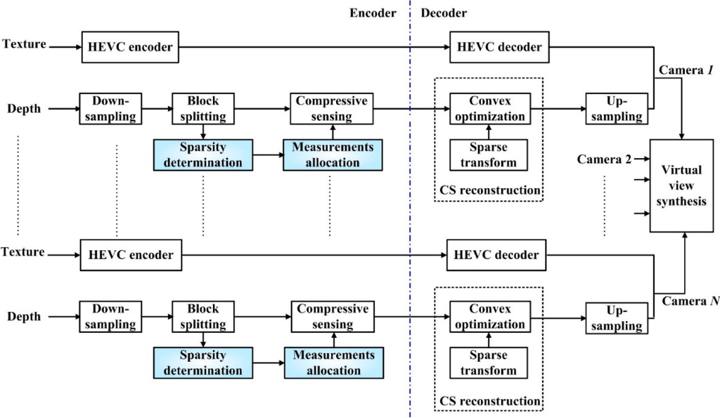 Figure 2 illustrates the block diagram of the proposed scheme. N views from Cameras 1 to N can be processed independently and each view includes texture video and its corresponding depth image. Since texture video is very similar to the traditional two-dimensional (2-D) video, it can be compressed by a standard codec, such as High Efficiency Video Coding (HEVC), for high compression efficiency. In this paper, we focus on the compression of depth images. In view of the sparsity of depth images, a block compressive sensing method is applied to compress them. Firstly, in order to reduce the amount of computation, the original depth image can be down-sampled [13] and the sampling rate can be set as 0.5. Then the entropy of pixels in each block can be calculated to determine the sparsity in the pixel domain. According to the sparsity, adaptive measurements can be allocated to each block for better compression efficiency. It is noted that in order to reduce the complexity of the CS encoder, the sparse transform can be shifted into the CS reconstruction. Therefore, at the decoder CS recovery can be obtained by solving a convex optimization problem combined with the sparse transform.