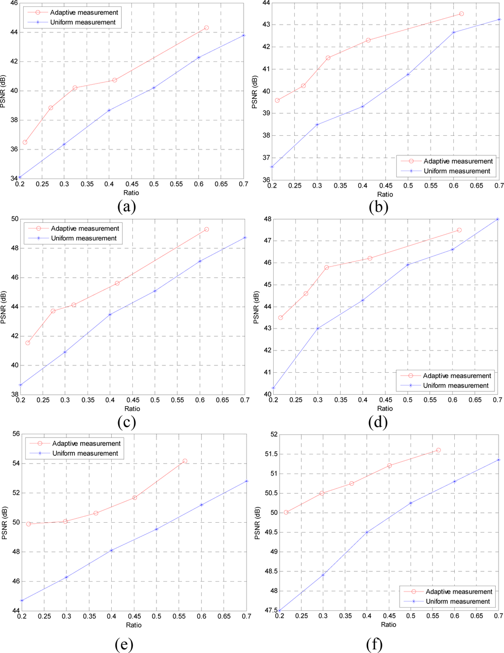 It can be seen from Figure 7a,c,e that the proposed scheme outperforms the uniform sampling scheme in PSNR values of depth map at the same ratio. Here, the ratio is the average ratio or average sampling rate for adaptive measurements. In the three tested sequences, the PSNR values of the sequence Pantomime are higher than the two other sequences because this sequence has more smooth regions and better sparsity.