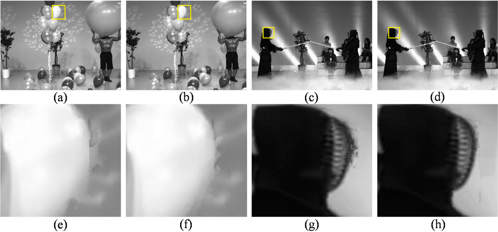 Subjective quality comparison of synthesized virtual viewpoint for Balloons and Kendo. (a), (c), (e) and (g): uniform sampling; (b), (d), (f) and (h): proposed scheme.