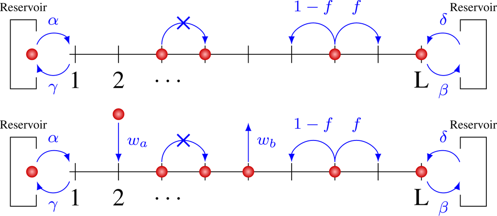 In this paper, we have considered a modified version to the ASEP model-hereafter named the CASEP model (for Changing ASEP model) or the LK-CASEP model when Langmuir dynamics is added-so as to be able to change the particle flux. A class of toy models for out-of-equilibrium systems consists of variants of the exclusion process (with open boundaries): let us consider a one dimensional lattice gas model composed of L sites between two reservoirs. Each site contains at most one particle. The particle undergoes a random walk on the lattice with the following rules: at each time step a site is chosen randomly. If this site belongs to the bulk and is occupied by a particle, the particle can jump right with a probability p and left with a probability q provided the neighboring sites are empty. At the boundaries, the system is coupled with the two reservoirs: at the left (resp. right) boundary, particles from the reservoir can enter the lattice with probability α and particles from the lattice can exit with probability γ (resp. δ and β). This coupling is equivalent to imposing the respective densities and . When ρa = ρb, the system reaches an equilibrium state, while it becomes increasingly out-of-equilibrium as the difference between ρa and ρb increases. The numerous variants of the exclusion process depend on choices of constraints on the hopping rates p and q: the symmetric simple exclusion process (SSEP) imposes p = q. Imposing a preferred direction for particle transport (e.g., p > q) yields the asymmetric simple exclusion model (ASEP). An extreme case is the totally asymmetric simple exclusion model (TASEP), for which q = 0. Here, we shall consider a particular class of ASEP, by imposing that the particle has to hop to a neighboring site—provided it is empty; it cannot remain in place unless both the neighboring sites are occupied (see Figure 1).