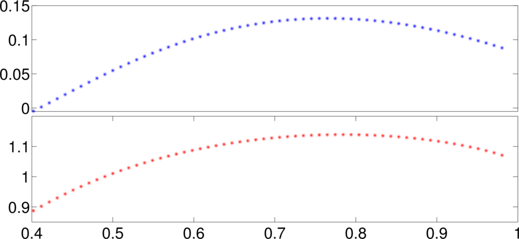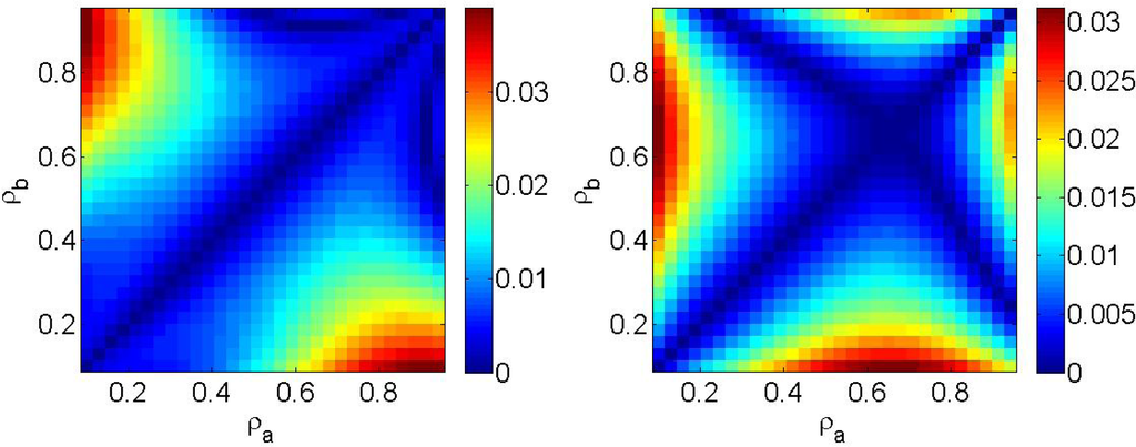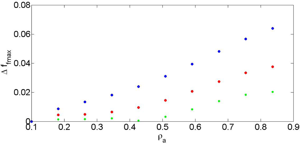 Given a value of L, ρa and ρb, we have computed the stationary states of the CASEP model as a function of f and used them to compute numerically the entropy production in Equation (6) and the Kolmogorov-Sinai Entropy in Equation (4). An example is provided in Figure 2 for ρa = 0.75, ρb = 0.1 and L = 10. We see that both function are of approximate parabolic shape, reaching a maximum for f ≥ 1/2. In the sequel, we note fmaxep (resp. fmaxks the value of f at which the maximum of the entropy production (resp. of the Kolmogorov-Sinai entropy) is reached. The existence of a maximum of entropy production can be simply understood by considering the case L = 2, i.e., a model with only two boxes, where we assume for simplicity that ρa > ρb. Noting ρ1 and ρ2 the density of the box number 1 and number 2 respectively, it is easy to see that for J = 0, σthermo = 0 whereas for J large enough ρ1 = ρ2 and σthermo = 0. Thus, in between these two values of J, σthermo has at least one maximum. We do not have such heuristic explanation for the existence of the maximum of the Kolmogorov-Sinai entropy. We note that although the entropy production and the Kolmogorov-Sinai entropy have similar parabolic shape, they do not coincide exactly: the entropy production and the Kolmogorov-Sinai entropy differ. For ρa = ρb (i.e., at equilibrium), their maxima take a common value fmaxep = fmaxks = 1/2, corresponding to the maximum of entropy: at equilibrium, all functionals are maximum for the same stationary state, corresponding to the “conductive state”. As the difference between ρa and ρb increases, the two maxima fmaxep and fmaxks deviates from the equilibrium value . This is the signature of a “convective dynamics”. We would like now to explore the behaviour of the two entropy around this conductive state, by studying the behaviour of the maxima difference, Δfmax=|fmaxep − fmaxks|.