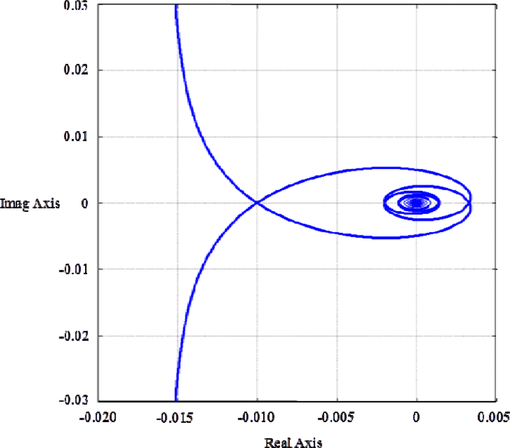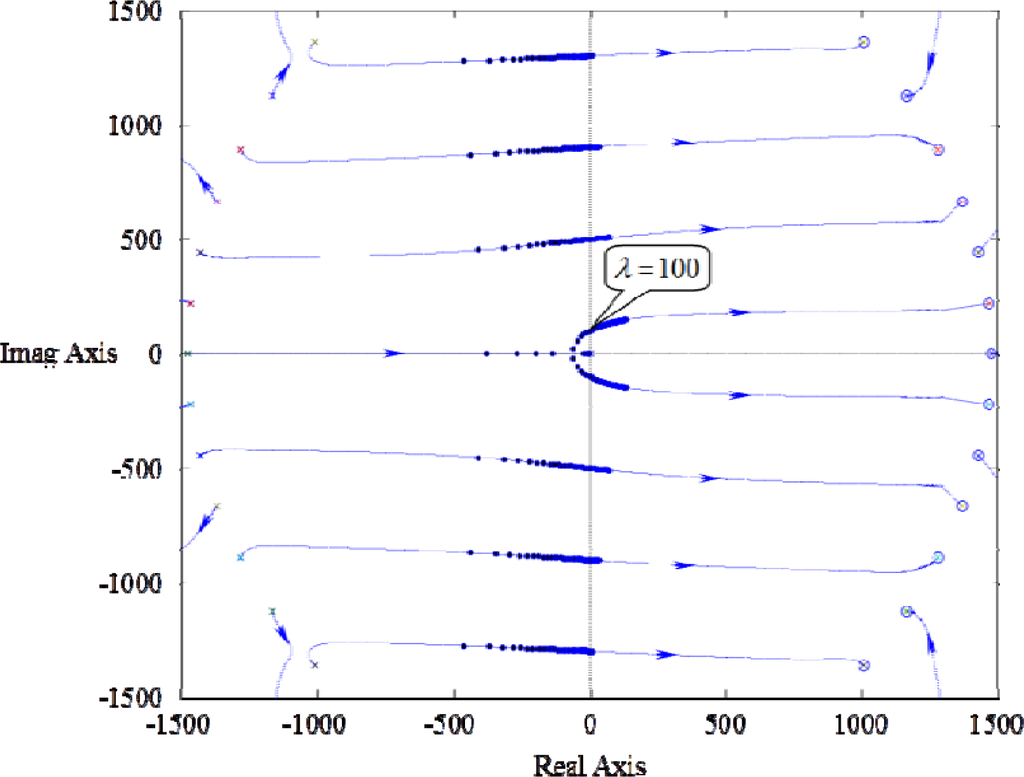 Figure 3 is the Root Locus of 1 + λe−τs/s = 0 (λ ≥ 0) for τ = π/200. It shows that the transfer function in Equation (33) starts to have RHP poles when the eigenvalue λ is larger than 100, and are getting more RHP poles along with the increase of λ. This yields the same message as that from the Figure 2, in which the Nyquist plot of the transfer-function in Equation (33) begin to encircle (−1,0) as the eigenvalue λ is larger than 100, and the number of encirclements is increased with larger λ.