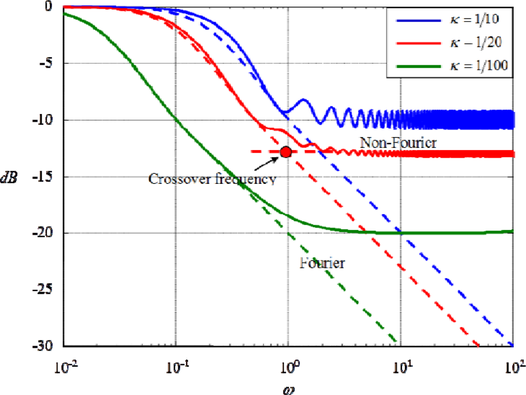 With these special properties, we are able to accurately and reliably identify thermal inductance in the frequency domain by adjusting the length of heat-conducting materials. Note that the thermal vibration implied in the non-dimensional modeling of Equation (43) involves a constant damping across all modes. This means that the damping ratio of each mode is inversely proportional to the square-root of its stiffness. In the Bode plot, both higher stiffness and damping ratio yield smaller amplitude ratios and both effects arrive at a balance after the crossover frequency.
