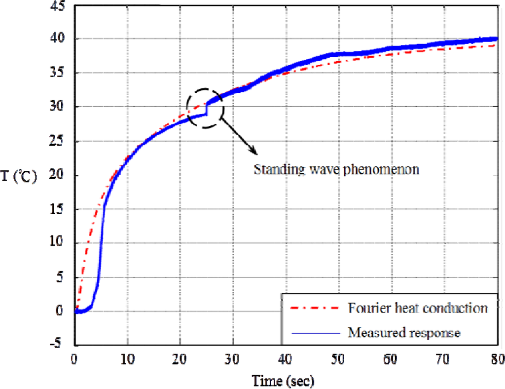 Figure 6 shows the typical responses as the laser delivers a series of pulses to the right boundary. Compared with the calculated response of Fourier heat-conduction, the measured non-Fourier response exhibits diffusion lagging initially, but quickly they are indistinguishable to each other until the thermal wave is reflected from the left end back to the right end as a small jump to be measured. This standing wave behavior is getting obvious as the length of meat is cut shorter. However, we find that the identification of thermal inductance through the measurement of standing-wave behavior is unreliable. Similar problems also happen at other measurements in time domain, wherein catching the jump with high-bandwidth sensing is always severely contaminated by white-noise, and filtering out white-noise often seriously degrades the jump-signal.
