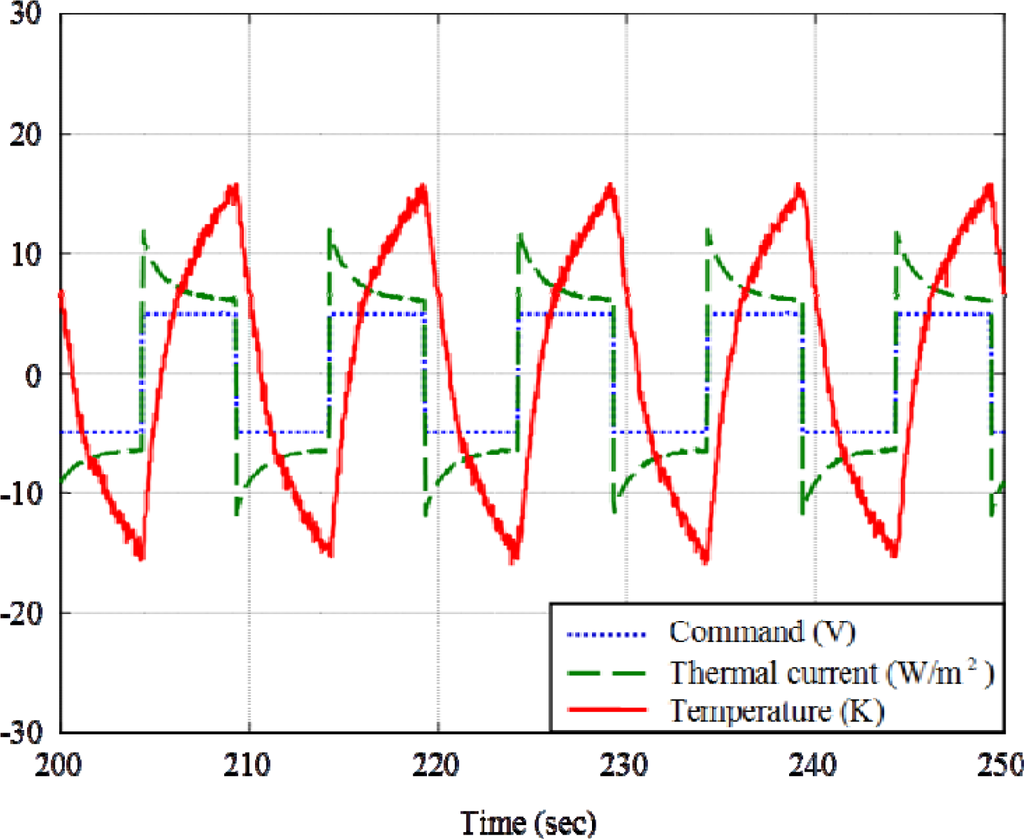 As shown in Figure 4, the instrument to measure thermal inductance comprises a short-pulse laser and its driver for boundary actuation, low-frequency limit-cycle generator, USB4711 data acquisition, Matlab-to-dsPIC networking, distributed temperature sensor and cooler/heater, instrumentation amplifiers, constant-temperature heat sinker, and some supported mechanism. Meat is firstly chosen as the heat-conduction material. The short-pulse laser inputs pulse-width modulated (PWM) thermal current to the right boundary of the conduction material, where the temperature is converted by K-type thermocouples into voltage signals that are tremendously amplified by the instrumentation amplifier and then acquisitioned into a generous-purpose computer through USB4711 communication. The Matlab-to-PIC software is made for integration of dynamics synthesis in the generous-purpose computer and implementation of dynamics into DSP-based controllers. The DSP-based limit-cycle generator plays as the frequency synthesizer of the PWM duty of heat flow from the short-pulse laser.