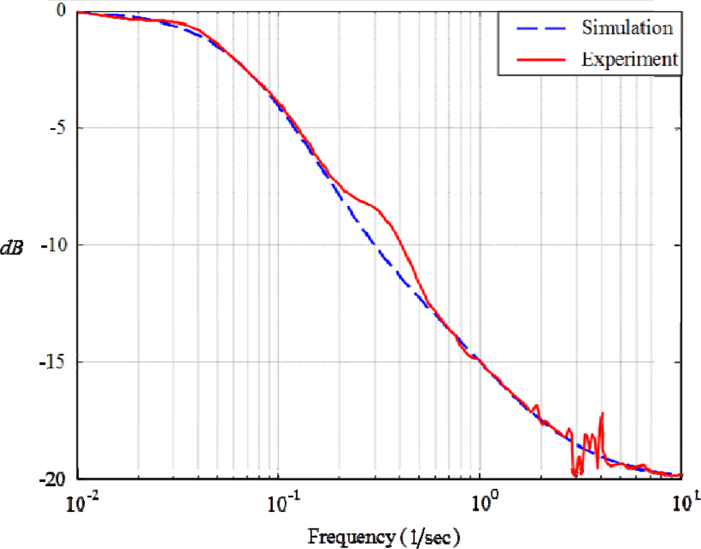 We collect as the frequency response y of the heat conduction the steady-state sinusoidal responses across a span of input frequencies of heat flow u imposed on a preset DC-level. Temporal responses can further be sent into spectrum-decomposition to calculate out reliable amplitude ratios, figuring out a Bode magnitude plot. Based on Equation (45), the dimensionless frequency response in this experimental setup is