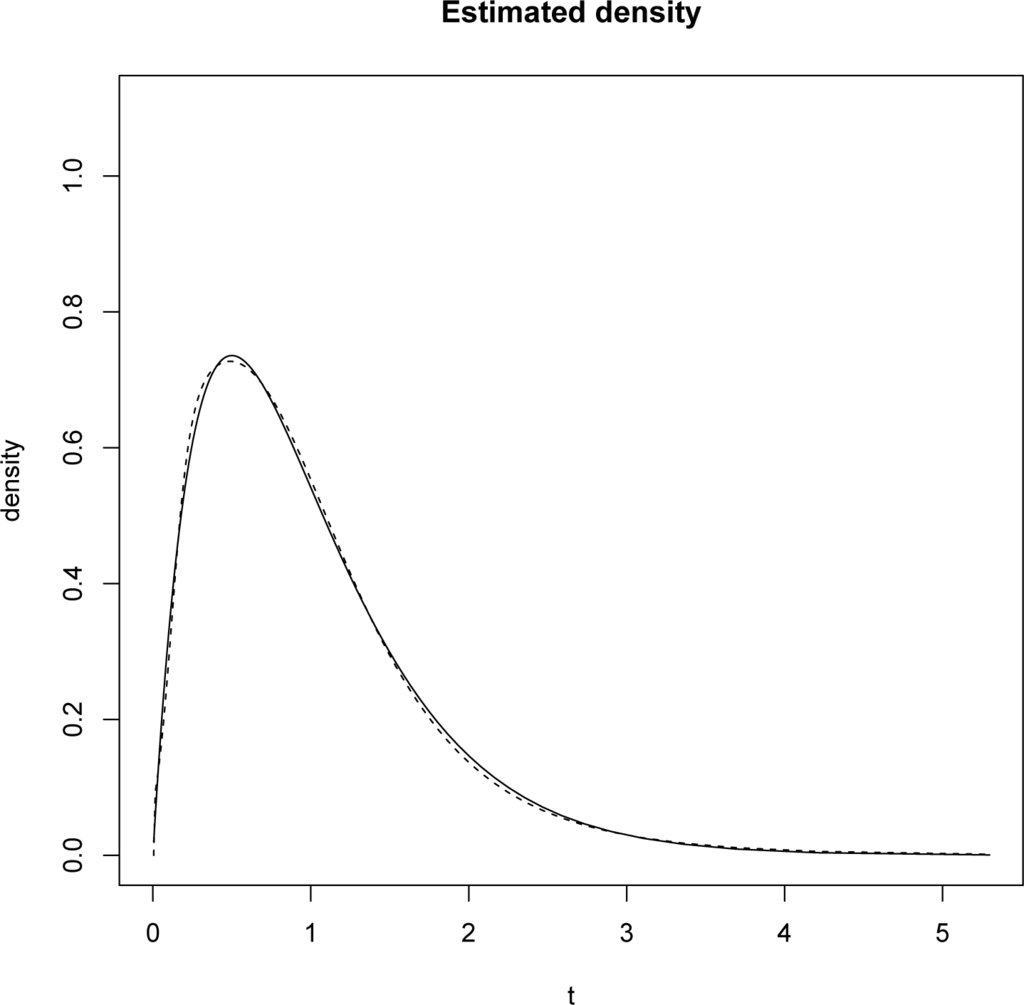 To find the minimizer, we use the Barzilai-Borwein code available for R, see [15]. Once the optimal λ is obtained it is inserted in Equation (14). That is the density of T on [0, 1]. To plot the density on [0, ∞) we perform the change of variables mentioned above and the result is plotted in the Figure 1.