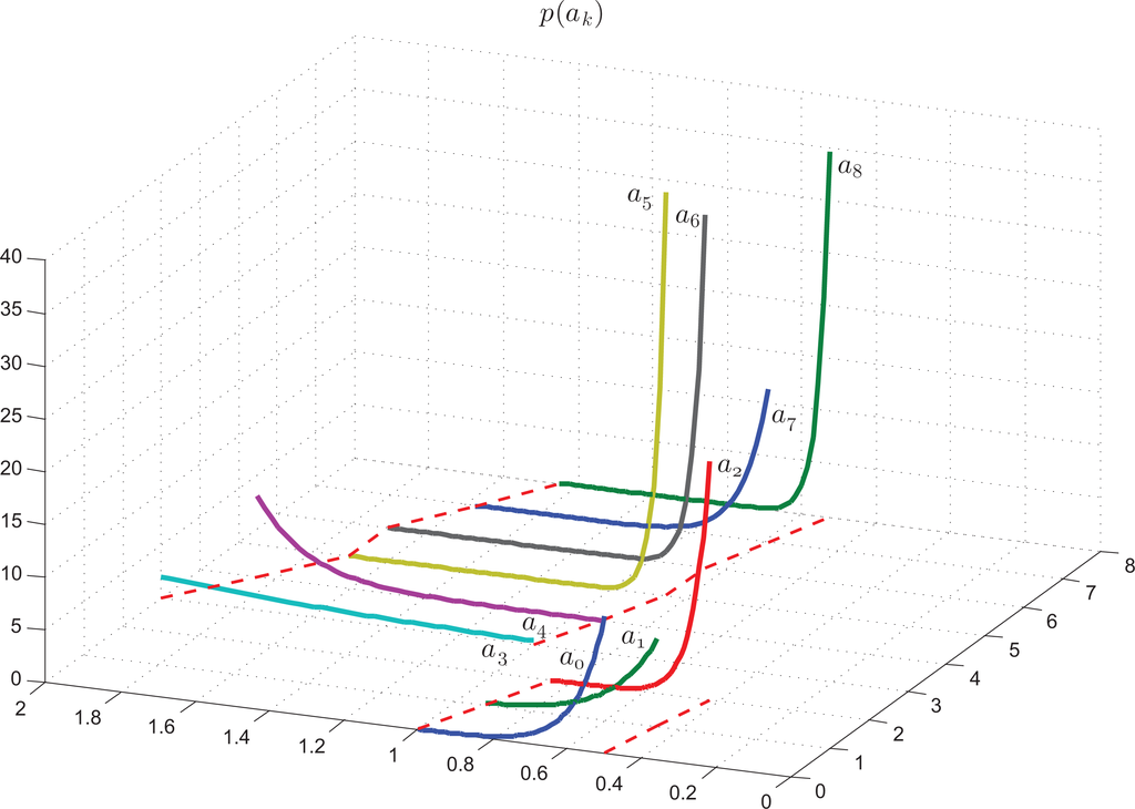 Figure 5 shows the curves of the probability density functions of the parameters, pj(a(1)j), j ∈ [0, 2] (curves 0,1,2) and pj(a(2)j), j ∈ [3, 8] (curves 3–8). Finally, Figure 6 presents the curves of the probability density functions of the noise, q0(ξ0), q1(ξ1).