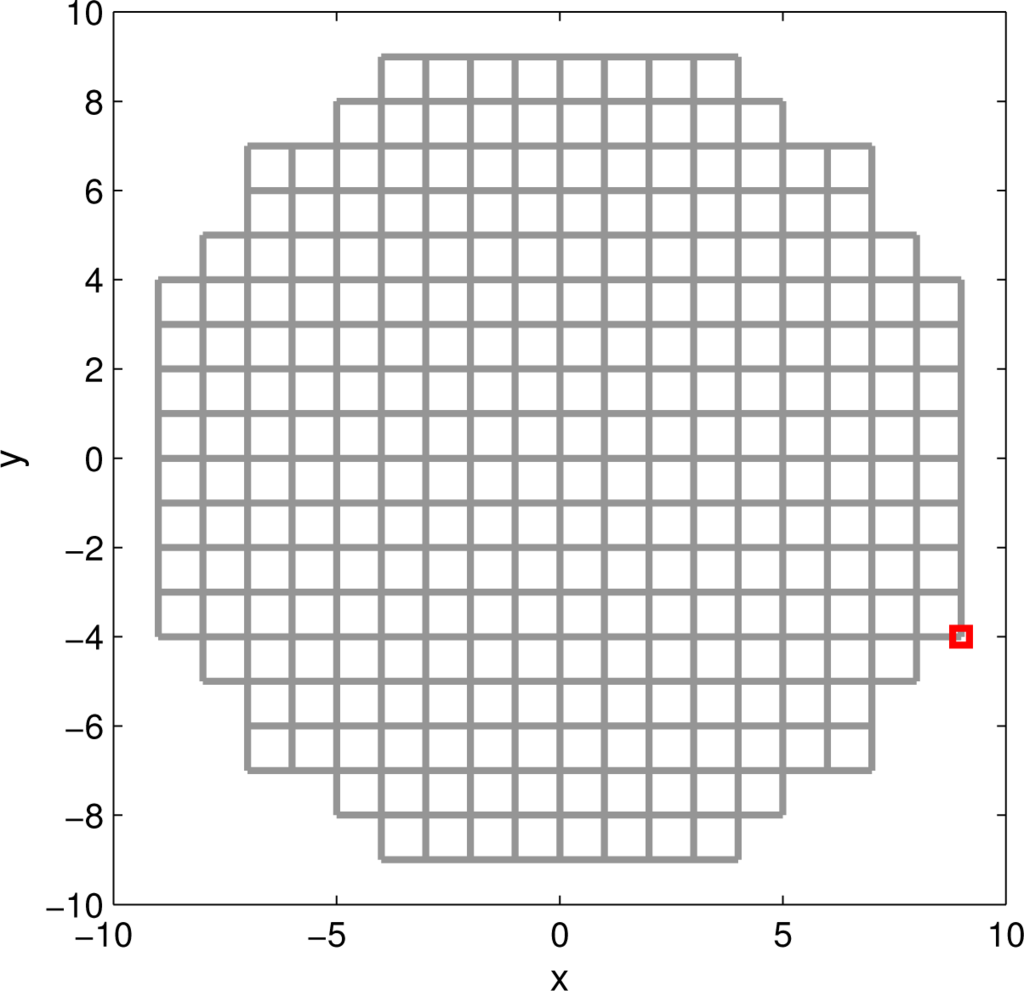 We therefore adopt an alternative approach, where the continuous model of the tracer diffusion process is replaced with a random walk on a square lattice, adopted as a discrete model of the search area. Discretisation is illustrated in Figure 1 for a search area centred on the origin of the coordinate system, with the radius R0 = 9. The length of each link (edge, bond) in the lattice determines the resolution of discretisation and, in this example, is adopted as a unit length. The source, assumed to be located at one of the nodes of the lattice, is emitting particles that travel through the lattice according to the random walk model [26].