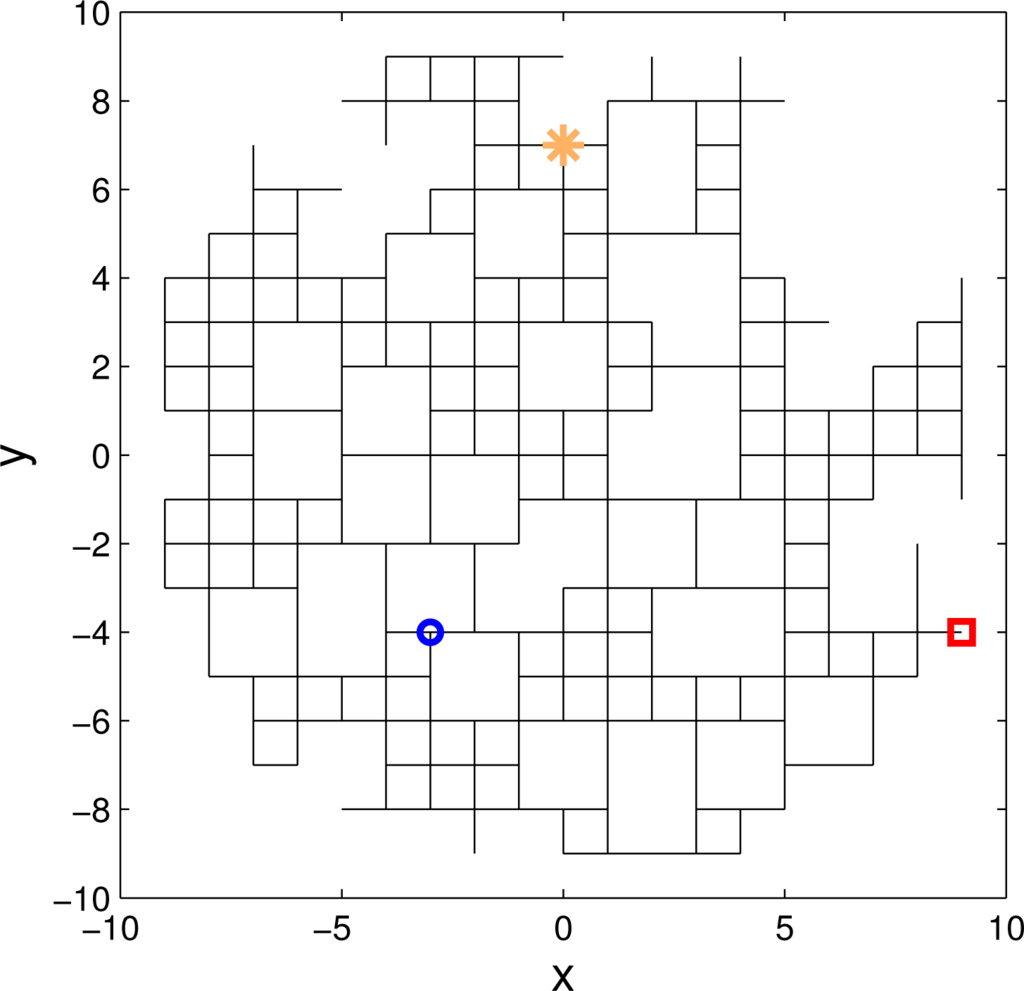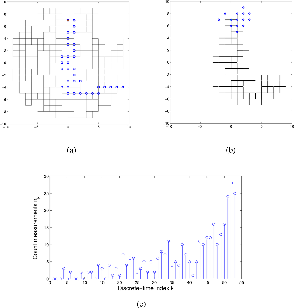Figure 6 illustrates a typical run of the search algorithm. The true path of the searcher on this run is shown in Figure 6a. It took the searcher 53 time steps to reach the source. During the search, the motion control vector failed to execute correctly on two occasions. The final estimate of the map (i.e., of existing links of the square lattice) is shown in Figure 6b. This figure shows only the links whose probability of existence is higher than 0.6. The blue circles in Figure 6b indicate the posterior distribution of the searcher final position. Its true position, which is the same as the source position, is included in the support of this posterior, meaning that the search was successful. Moreover, on this occasion, the maximum a posteriori (MAP) estimate of the searcher final position coincides with the truth. Figure 6c shows the measured values of the count number, nk, along the path. As we discussed in the Introduction, the measurements are sporadic, especially in the beginning, when the distance between the searcher and the source is large: among the first ten count measurements, only three indicated a non-zero tracer concentration. An avi video file, illustrating a single run of the algorithm, is supplied with this paper.