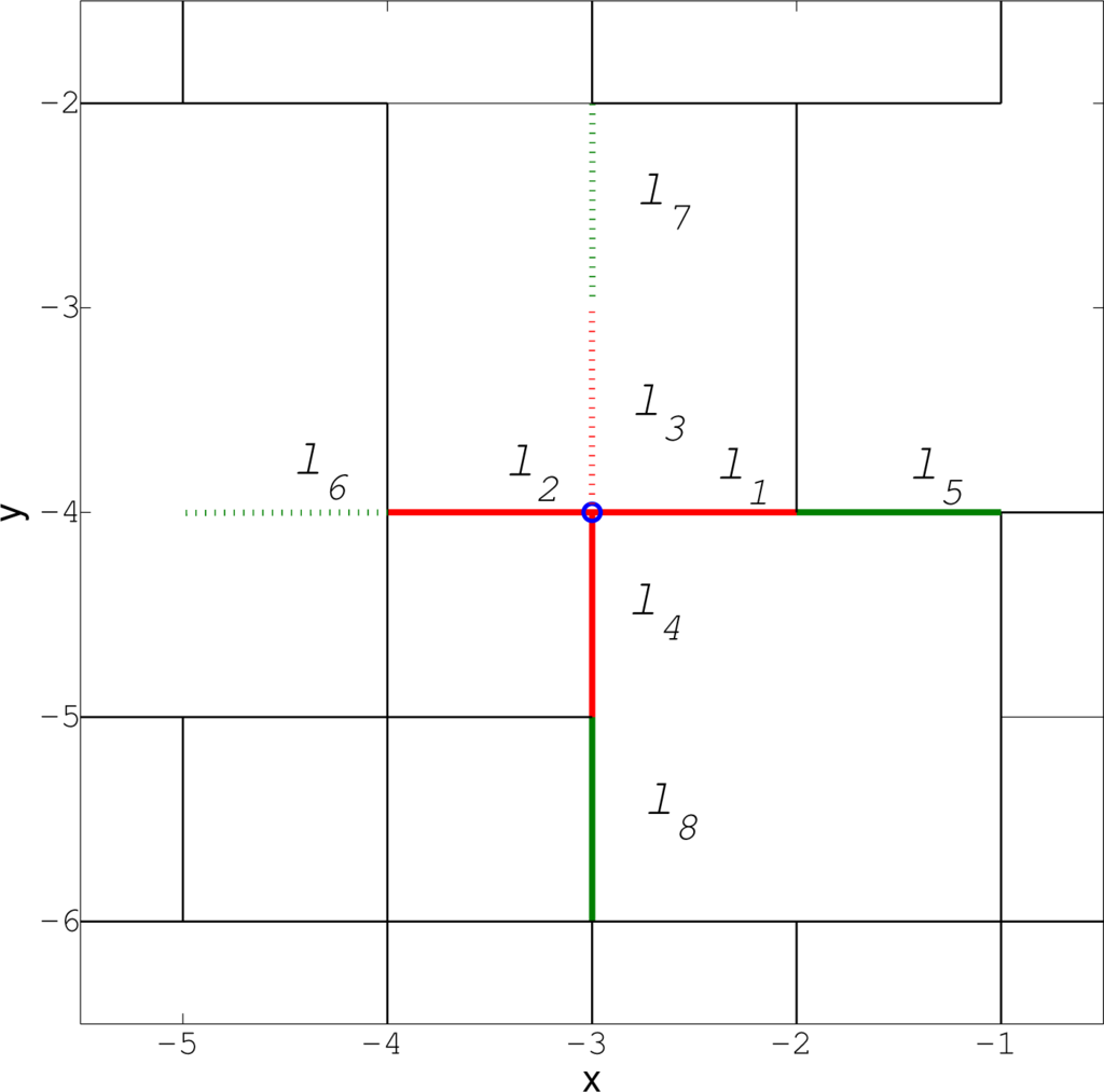 A link in a grid of Figure 2 is defined by a quadruple (x1, y1, x2, y2), where (x1, y1) and (x2, y2) are the coordinates of the nodes it connects. In order to explain what we mean by primary and secondary links, consider for example the node at location (−3, −4) indicated by “o” in Figure 2; the zoomed-in segment is shown in Figure 4. The primary links from this node are the connecting links towards east, west, up and down from (−3, −4), plotted in red in Figure 4; for example, ℓ1 = (−3, −4, −2, −4). The status of a link, ℓ, denoted m(ℓ), is a binary variable with the convention that m(ℓ) = 1 means that the link ℓ exists. According to Figures 2 and 4, we have: m(ℓ1) = 1, m(ℓ2) = 1, m(ℓ3) = 0, m(ℓ4) = 1. Existing links are shown by solid lines in Figure 4, while non-existing links are plotted as dotted lines.