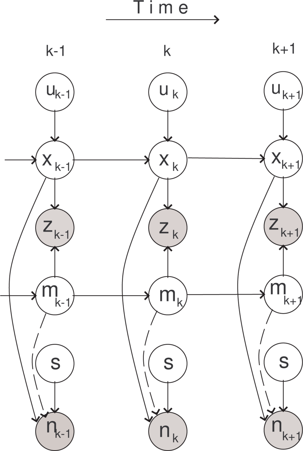 Recursion in Equation (9) involves intractable integrals in the denominator. In order to solve it, we adopt a numerical approximation based on the sequential Monte Carlo method [27]. Before going into details, notice that factorization expressed by Equations (10) and (11) imposes a structure, which can be conveniently represented by a dynamic Bayesian network (DBN) [28] shown in Figure 5. The circles in Figure 5 represent random variables: white circles are hidden variables; gray circles are observed variables. Arrows indicate dependencies. Arrows that are plotted by dashed lines are explained next.