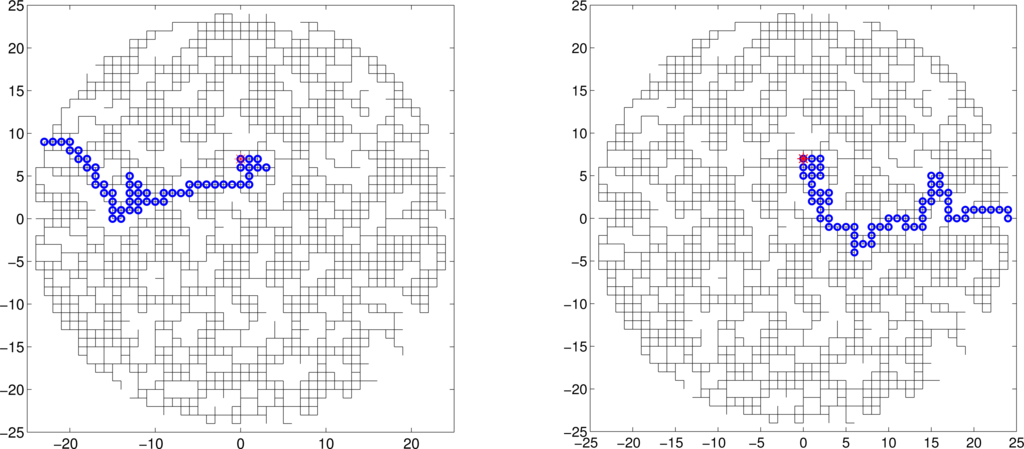 Figure 7 illustrates two search paths on a much bigger lattice, with the fraction of missing links p = 0.20. The source parameters were X = 0, Y = 7 and A0 = 16; all other parameters were the same as above. The duration of two searches was 84 and 103 time steps, respectively.