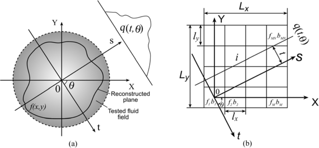 Like in medical CT, the projection data of fluid fields, which can be probed with optoelectronic sensors, are adopted to compute distributions of physical variables in the OpCT. From a mathematical point of view, the OpCT reconstruction problem can be formulated as the inverse Radon transform. As shown in Figure 1(a), the relationship between the 2-D physical function f (x, y) of a reconstructed plane of a tested fluid field and its projection q(t,θ) is given by: