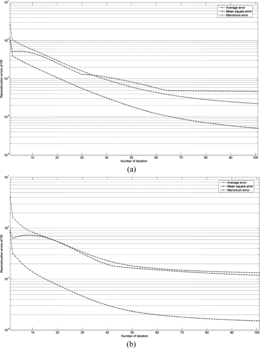 The four reconstructed images with the FE algorithm are shown in Figure 3, where the relaxation parameter α of FE is 0.3 for all the four physical models. Furthermore, the convergence of FE has been studied. Figure 4 shows the convergence properties of FE for the reconstructions of TCP and TR.