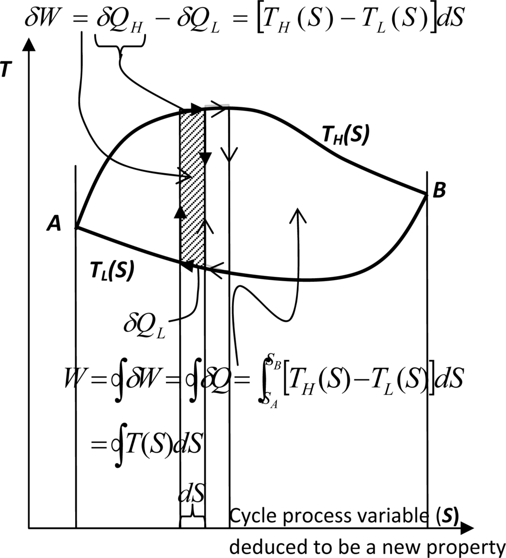 Equation (4) is well-known Clausius equality (more about Clausius inequality later), which defines new fundamental property entropy, since its integral is independent on process path between any two given points A and B, namely (compare with Equation (4)):