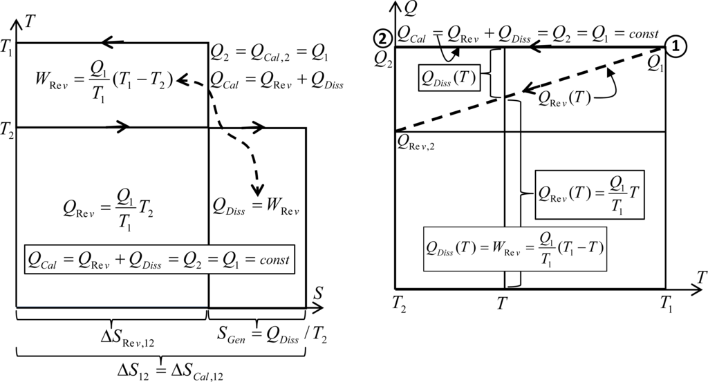 However, during a caloric process the work potential is completely dissipated into self-generated heat at lower temperature (QDiss = WRev), which after being added to the equally reduced reversible heat at lower temperature (QRe v), will result in conserved heat or thermal energy (QCal = QRe v + QDiss = const; i.e., caloric process) with increased, generated entropy in the amount of dissipated work potential per relevant absolute temperature, see Figure 2 (left).