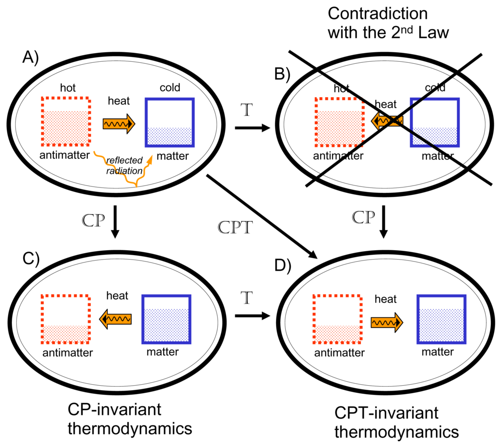 Since thermodynamics mainly deals with macroscopic scalar quantities, parity transformations are, generally, not important for a thermodynamic analysis(although, particles with opposite chiralities may need to be treated as different species in thermodynamics and kinetics). Here, we nevertheless preserve conventional notations adopted in quantum mechanics and retain P in transformations. The implications of having positive and negative α in Equation (1) are shown in Figure 1, which illustrates an experiment conducted by placing matter and antimatter in the focuses of a perfectly reflective ellipsoid. One of many possible initial states, which is shown in Figure 1A, is subject to the C, P and T transformations. Heat is transferred by radiation between matter and antimatter, and the direction of the heat transfer changes as the transformations are applied. In simple terms, T reverses the direction of the heat transfer, C converts matter into antimatter and vice versa, while P swaps the systems located in the focuses and reverses the heat flux accordingly. Since thermodynamic laws are not time-invariant, the T-transformation of Case (A) results in Case (B), prohibited by the second law. The other cases, (C) and (D), are possible and correspond to CP-invariant and CPT-invariant thermodynamics. Note that, since thermodynamics is not T-symmetric, it must also violate at least one of the symmetries, CP or CPT. The requirements of CP-invariant and CPT-invariant thermodynamics are thus incompatible, and only one of these thermodynamics corresponds to the real world. It is difficult, however, to determine how thermodynamics should be extended from matter to antimatter, due to the paucity of antimatter in the Universe. Both CP- and CPT-invariant thermodynamics give the same description for our current world populated by matter. While CP-invariant thermodynamics is conventional and does not need an extensive treatment here, it seems that CPT-invariant thermodynamics has not been considered in the past, and its implications need a detailed analysis.