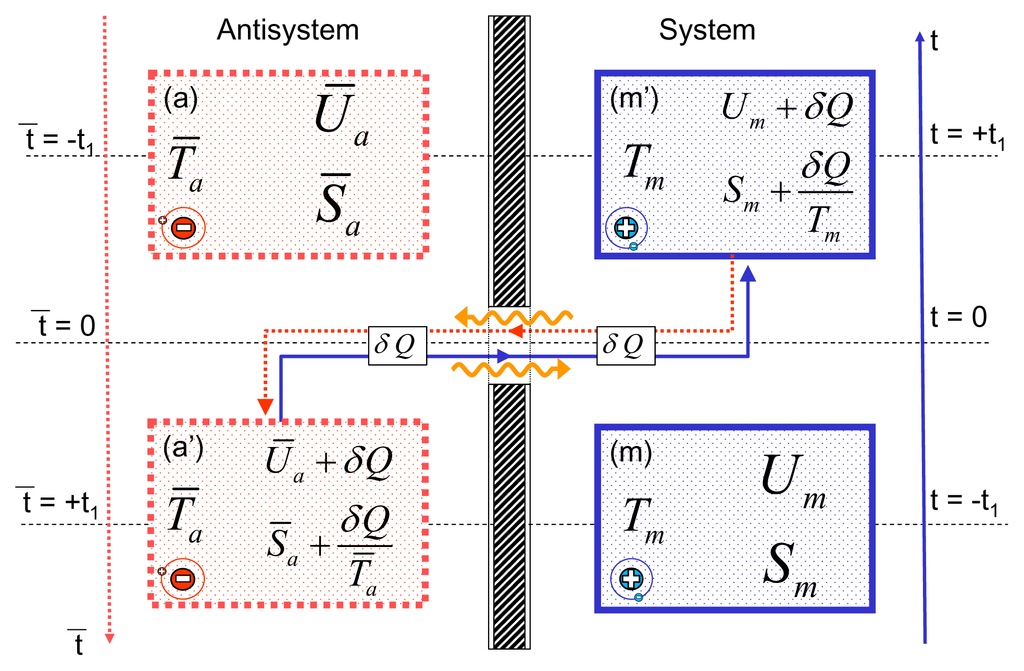 from our perspective. The sign of Ua is selected to be consistent with the first law of thermodynamics Equation (3), while the sign of Sa is chosen to be consistent with the definition of temperature and with Equations (6). The change of sign does not affect our interpretation of reversible transformations of antimatter, since Sa is constant whenever S̄a is constant, which is consistent with our assumption that matter and antimatter behave in the same way in reversible processes. The state of having the same positive (and finite) intrinsic temperatures Tm = T̄a does not correspond to equilibrium and, according to Equation (5), the transfer of heat from antisystem to system in the observer’s time is strongly favoured by thermodynamics.
