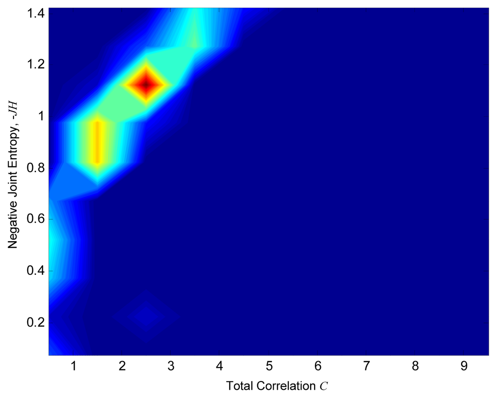Figure 4 shows intermediate results of two-dimensional frequency distribution of JH and C for ten divisions in both axes for some of the sets of monitors represented by a point in Figure 3. In the plots, the red area corresponds to the most probable JH and C values of the considered vector. Indeed, even if the vector is normalized varying the values of γ and a, it is possible to define which JH and C values have a high frequency of occurrence. While for lower number of quasi-optimal sets, colour intensity is lighter and more disperse. In order to summarize the results, all the distributions have been summed up at each axes division. The result is shown in Figure 5. It can be seen how the Pareto front is now smooth, and shows that parameters change for the estimation of Information Theory quantities has an important effect on the results. It is interesting to note that in Figure 5 the red area is more localized than for plots in Figure 4. Therefore, it is possible to define the most probable and thus, less uncertain combination of JH and C among all. The lighter colored area corresponds to less probable and more uncertain JH and C combinations. In this way Figure 5 can be seen as the plot of the uncertainty linked to JH and C solutions: the reddish the color, the more certain the combination.
