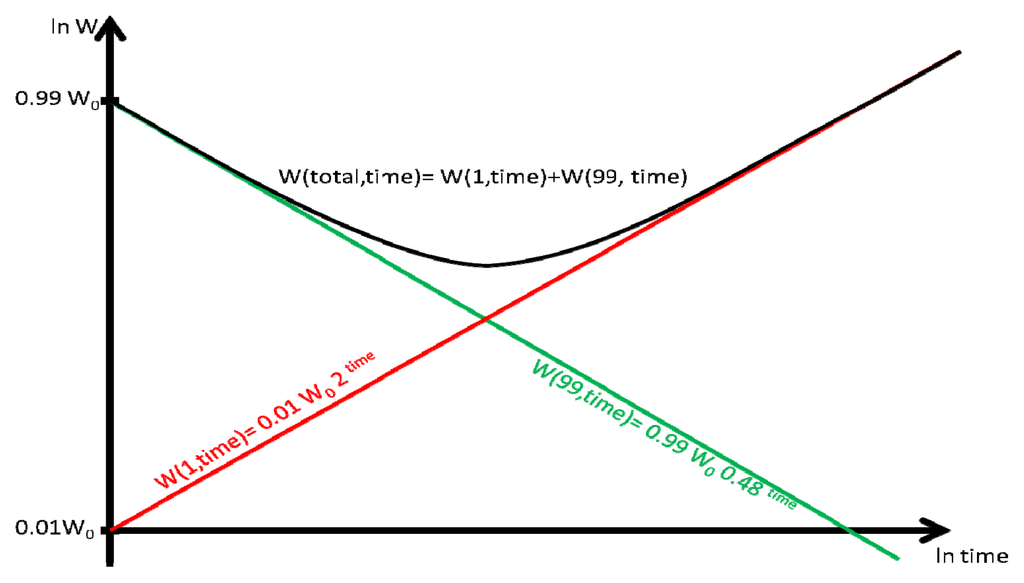According to Equation (6) and as visualized in Figure 1, at the beginning the average density will decay exponentially as 0.99·W0·0.48time (where time is measured in billion years) because the contribution 0.01·W0·2time of the growing 1% is negligible.