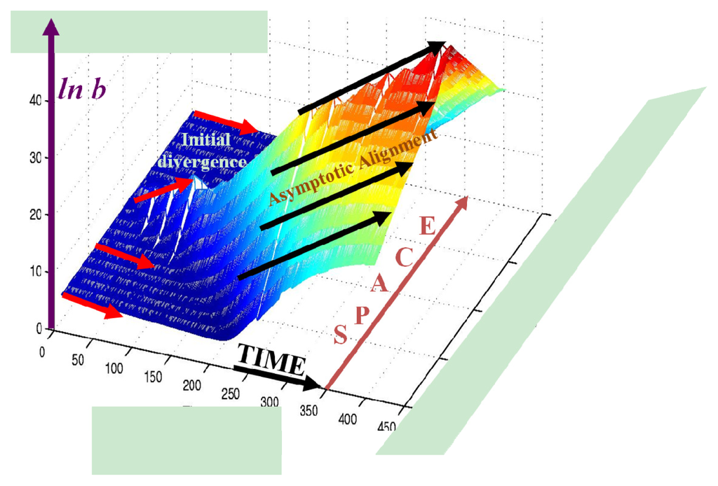 The main features are the “crossing exponential”: at the beginning of the process, 99% of the population resides in the negative growth regions and 1% in the growth regions. Thus the dynamics of the system as a whole is initially dominated by the decaying exponential. As time passes the initially small 1% population grows exponentially and the relative sizes of the two populations cross: one on its way to extinction and the other on its way to expansion. Eventually the population of the 1% growth volume constitutes nearly the entire total population. At this stage the dynamics of the system reduces entirely to a growing exponential.