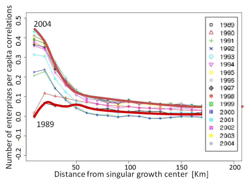In the rest of 1% of the locations increases at a rate of 200%. The fraction of the population in the growth region evolves thus according to the equation: